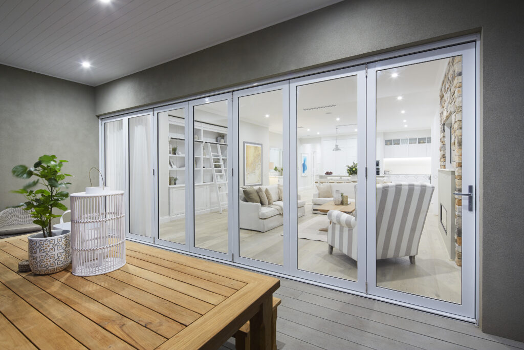 -Bi-Fold: A bi-fold system typically uses multiple hinge-connected panels that fold neatly against each other when opened.